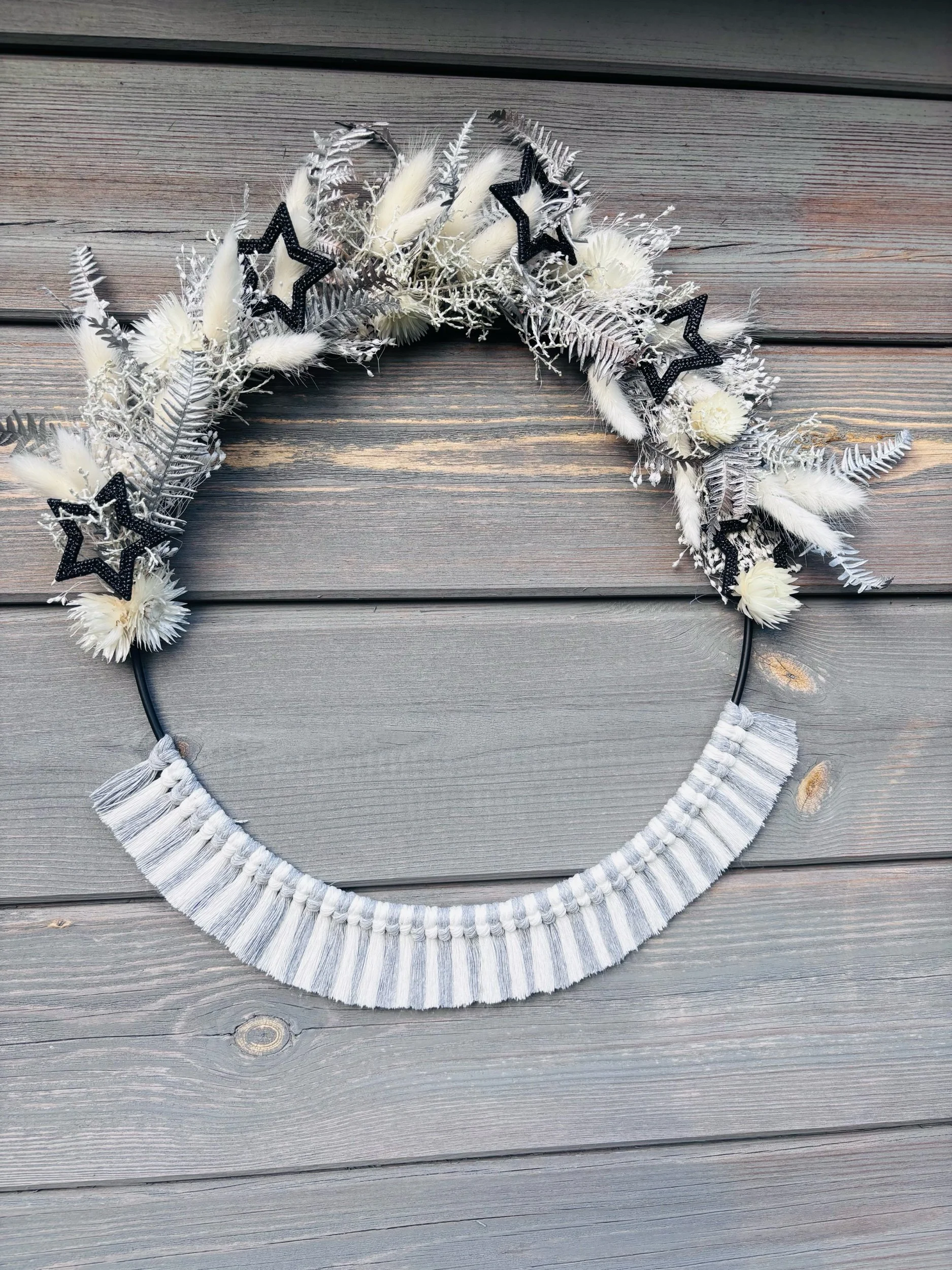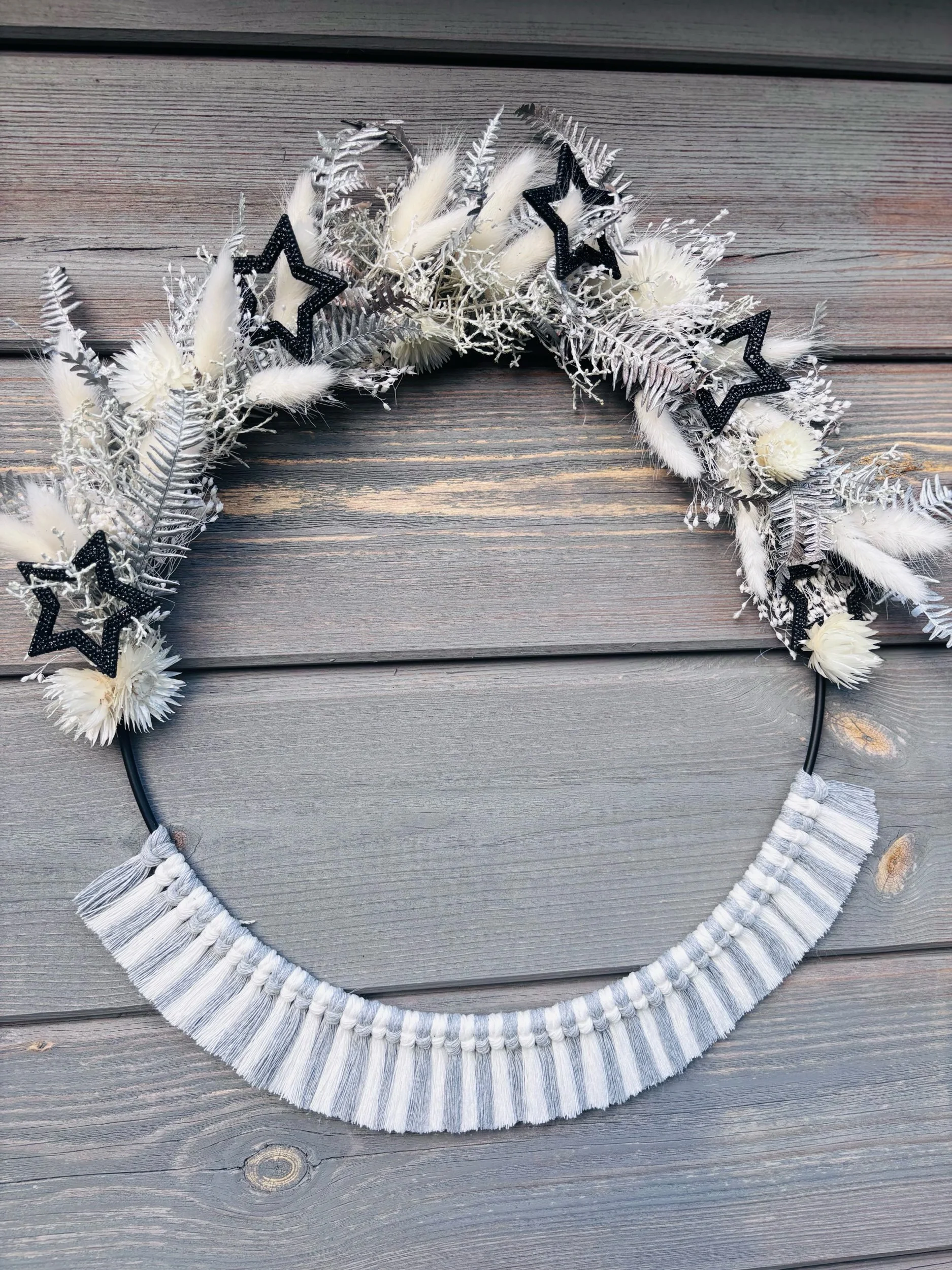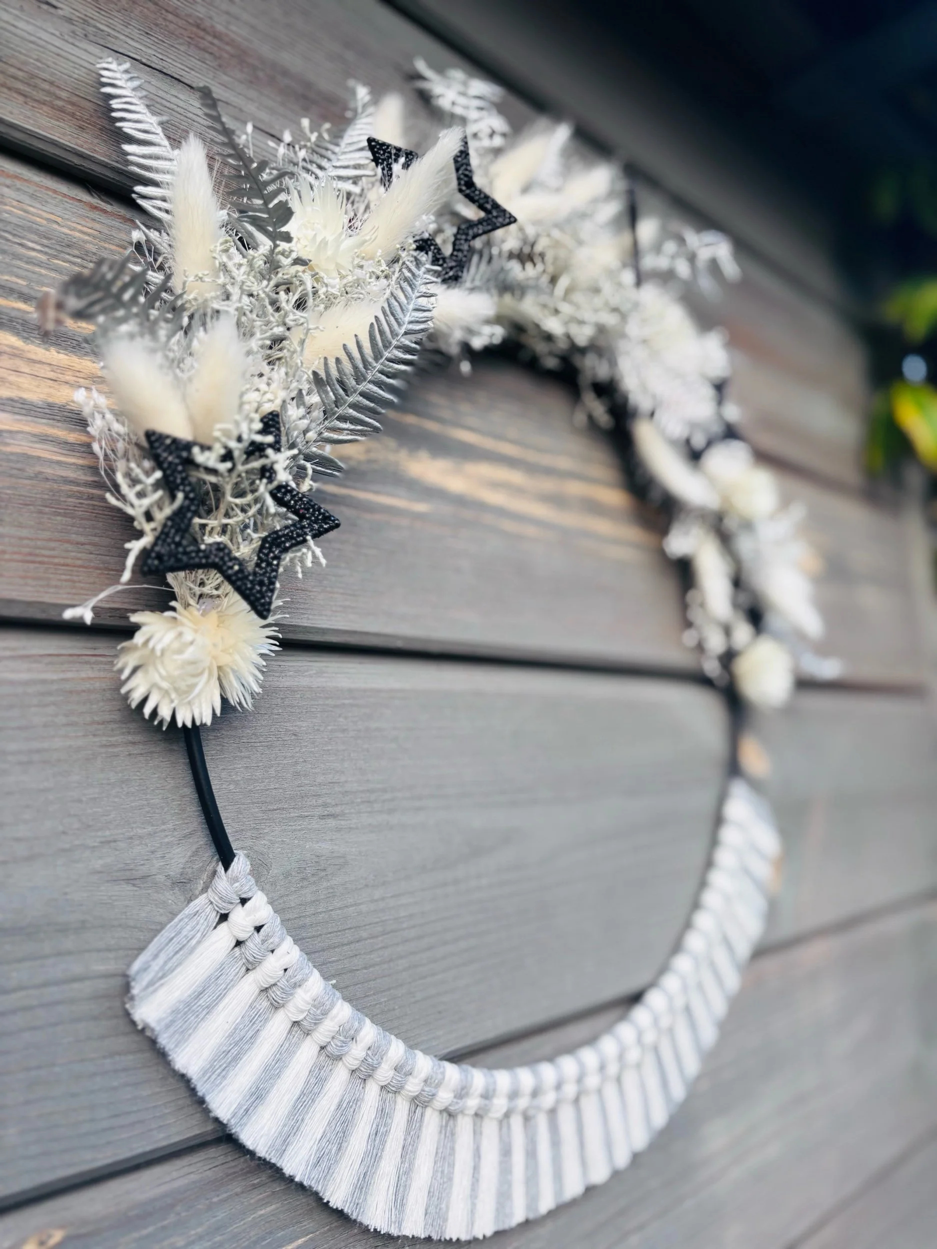 Cette couronne mêle fleurs séchées blanches, feuillages givrés, touches d’argent et étoiles décoratives pour un rendu doux et féerique. Le bas du cercle est habillé d’un macramé artisanal, apportant une finition chaleureuse et moderne.