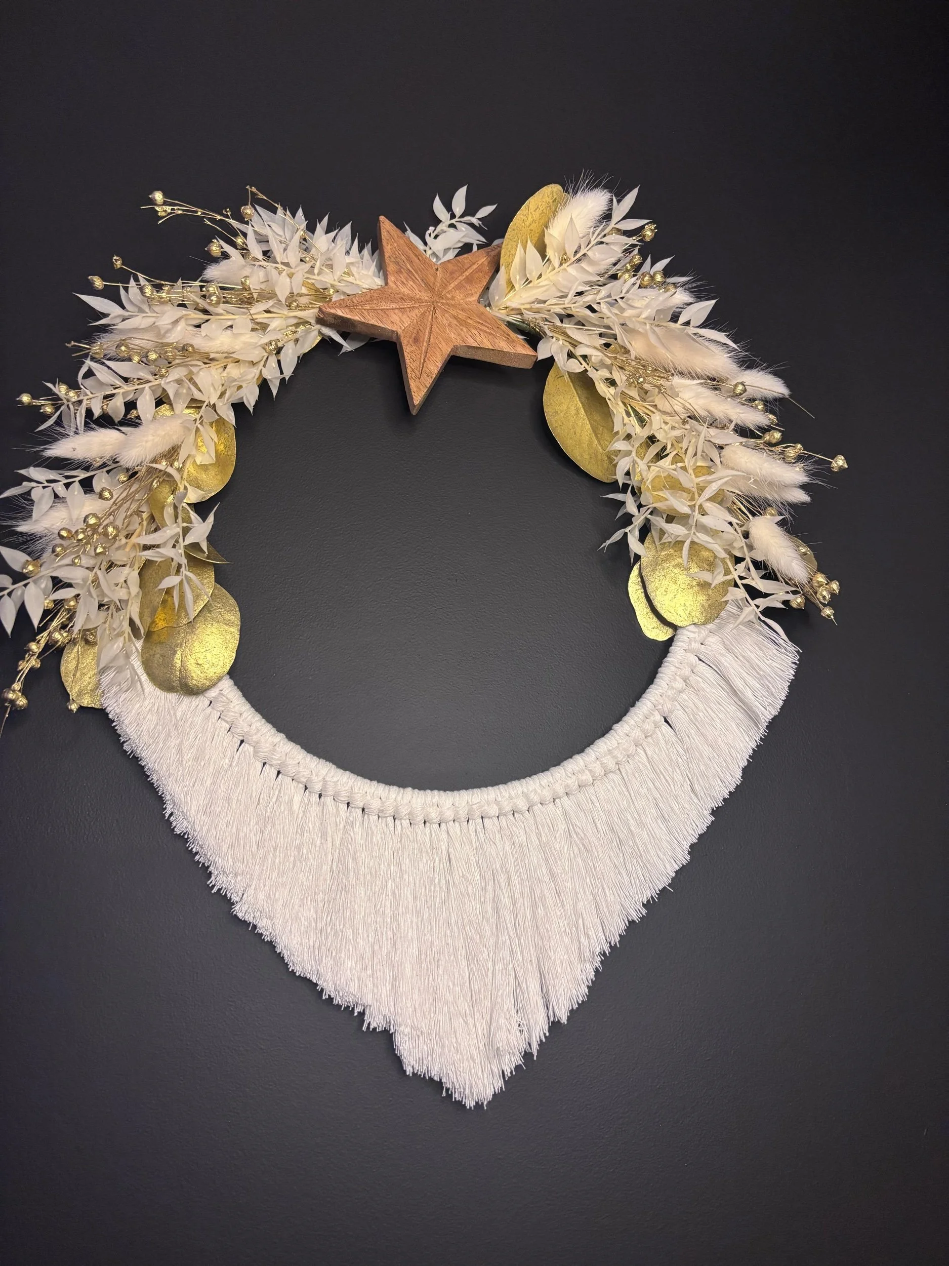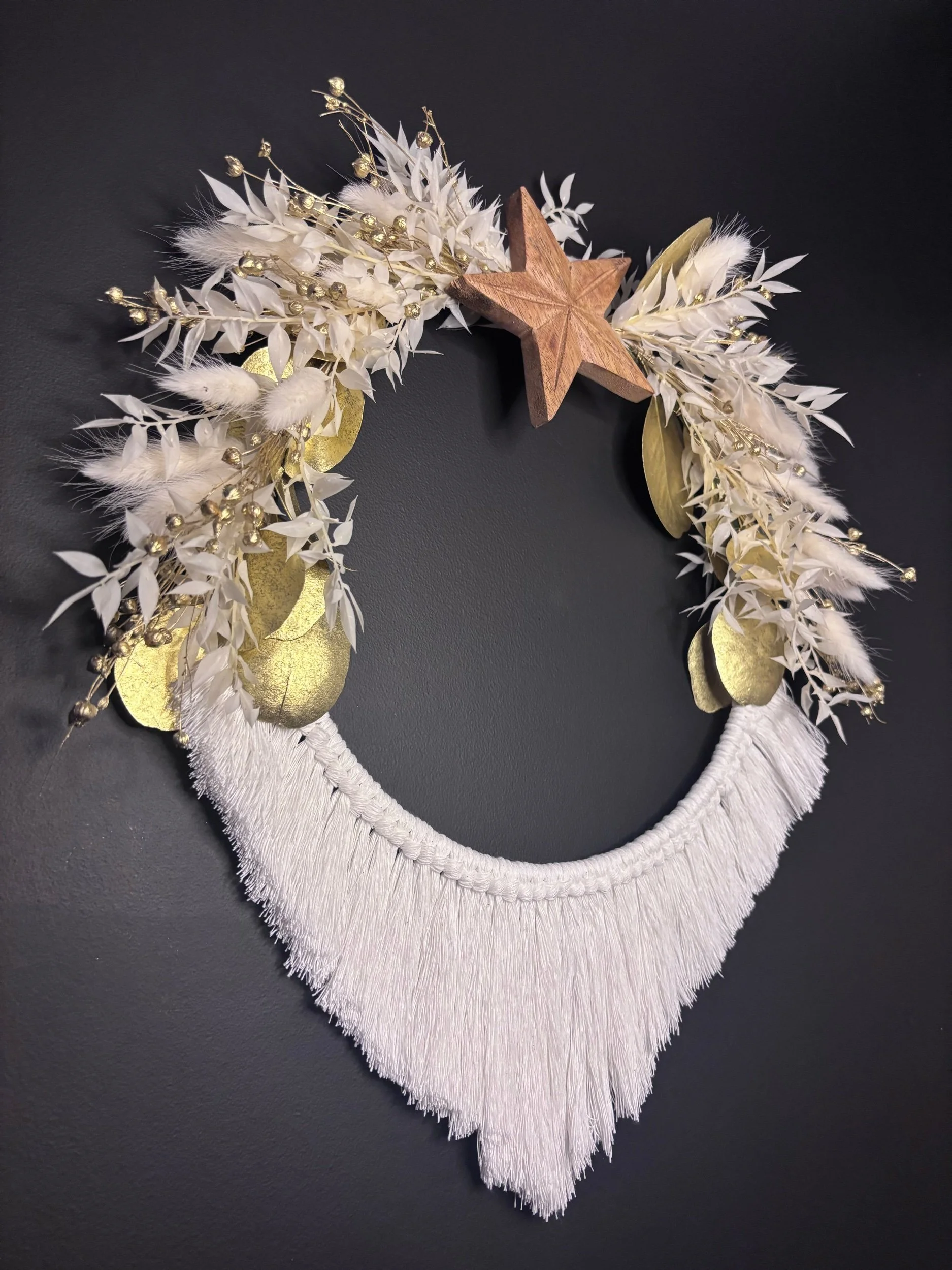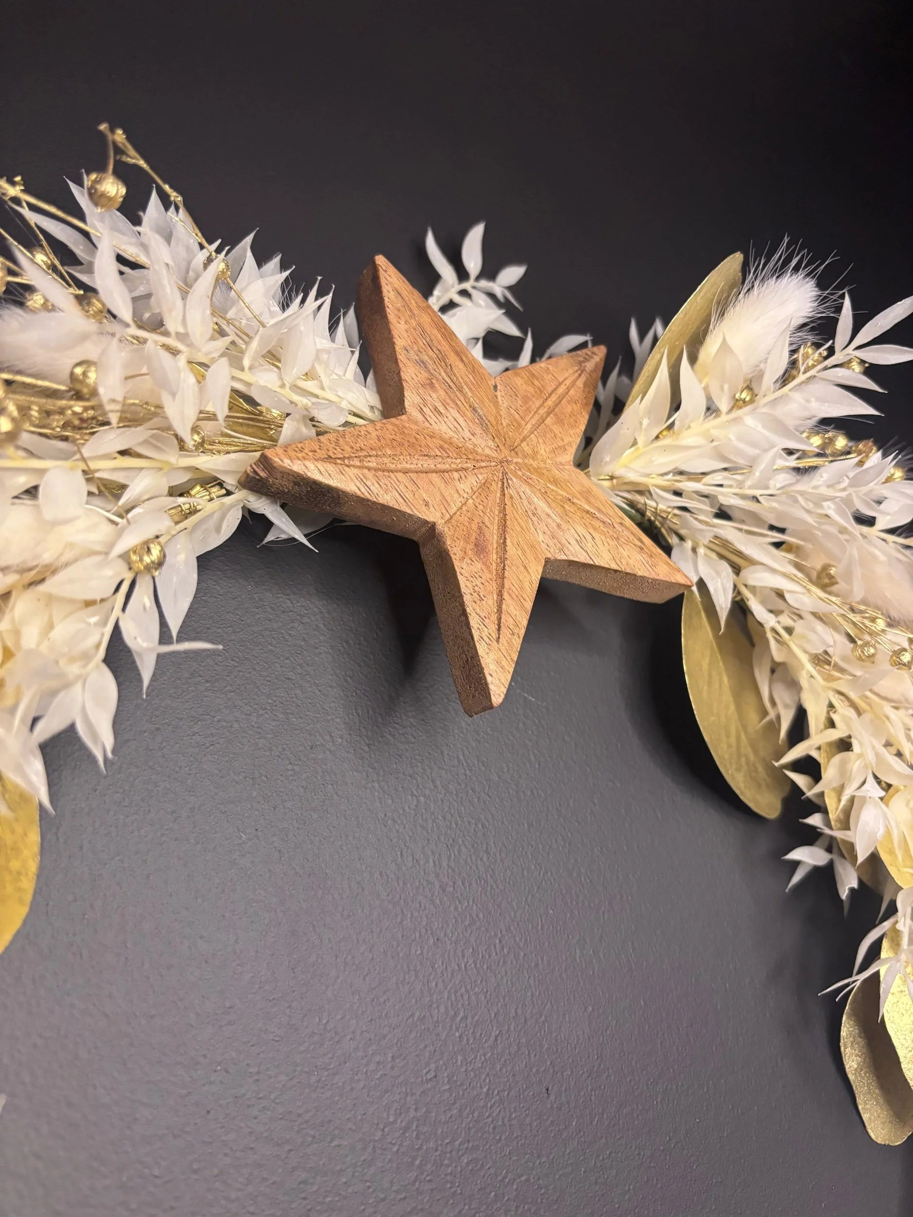Cette couronne associe des fleurs séchées blanches, des feuilles dorées, des perles décoratives et une étoile en bois centrale pour un rendu chaleureux, chic et poétique.